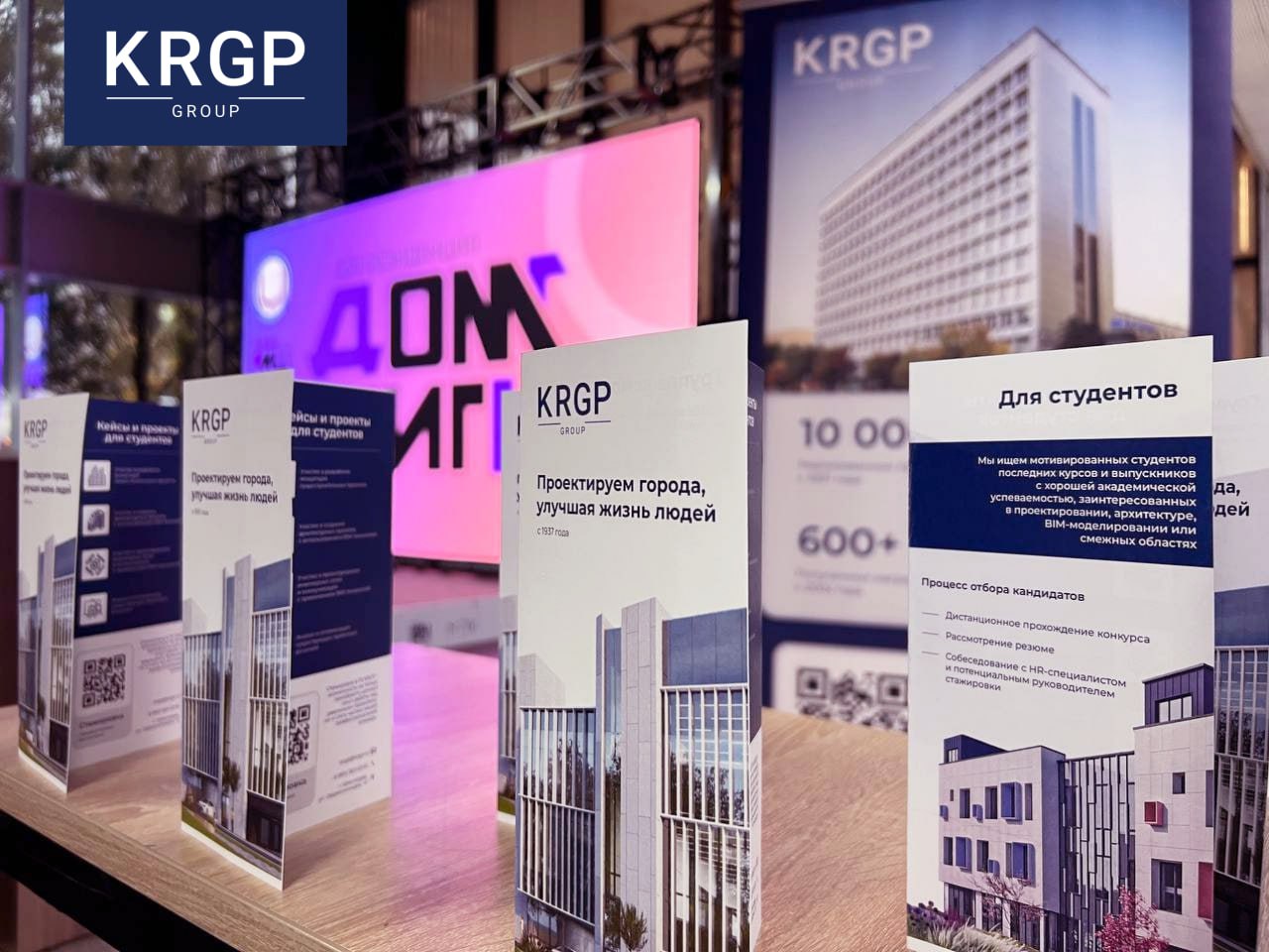 На сцене спикеров КГ KRGP представлял главный архитектор проекта Андрей Соляник. Он рассказал о своем профессиональном пути, особенностях запроектированных объектов и направлениях деятельности нашей группы компаний. Также Андрей призвал молодых специалистов следить за трендами в отрасли и уделять большое внимание новым технологиям в проектировании.
